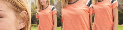 - Contrast color self-fabric collar and raglan sleeves