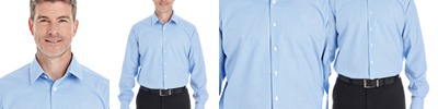 3.9 oz./yd² / 132 gsm, 60% cotton, 40% polyester dobby with wrinkle-free and stain-release performance; Stain-release and true non-iron performance straight from the dryer; Active fit; Patent pucker-free taped seams; Specially fused collar, cuffs and placket for total garment performance; Straight collar with built-in collar stays; Specially constructed adjustable collar for an extra inch of stretch; Fine yarn-count shirting with pealized buttons; Adjustable cuffs with button placket;