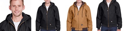 10 oz., heavy-duty cotton duck; Heavyweight quilt-lined taffeta liner; Water-repellent finish; Triple-needle stitched main seam; Heavy-duty brass zipper; Three-piece insulated hood with drawstring; Pleated elbows and action back; Two front patch pockets; Three inside pockets; Manufactured in a LEED (Leadership in Energy and Environmental Design) certified factory;